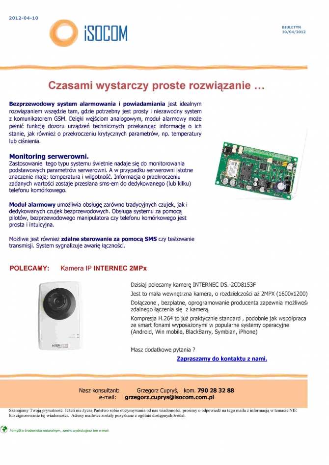 Zastosowanie tego typu systemu świetnie nadaje się do monitorowania podstawowych parametrów serwerowni. A w przypadku serwerowni istotne znaczenie mają: temperatura i wilgotność. Informacja o przekroczeniu zadanych wartości zostaje przesłana sms-em do dedykowanego (lub kilku) telefonów komórkowych.